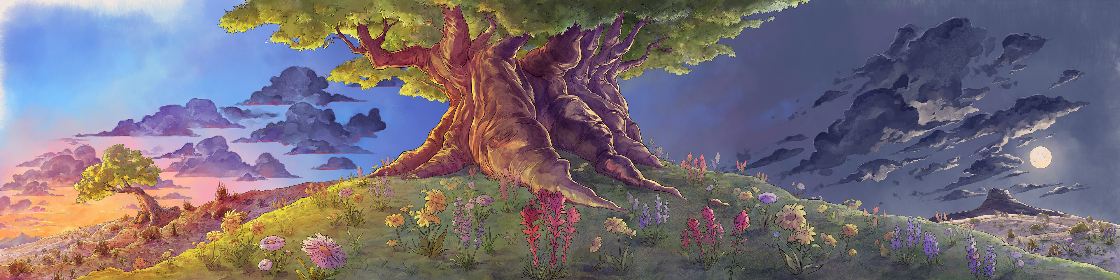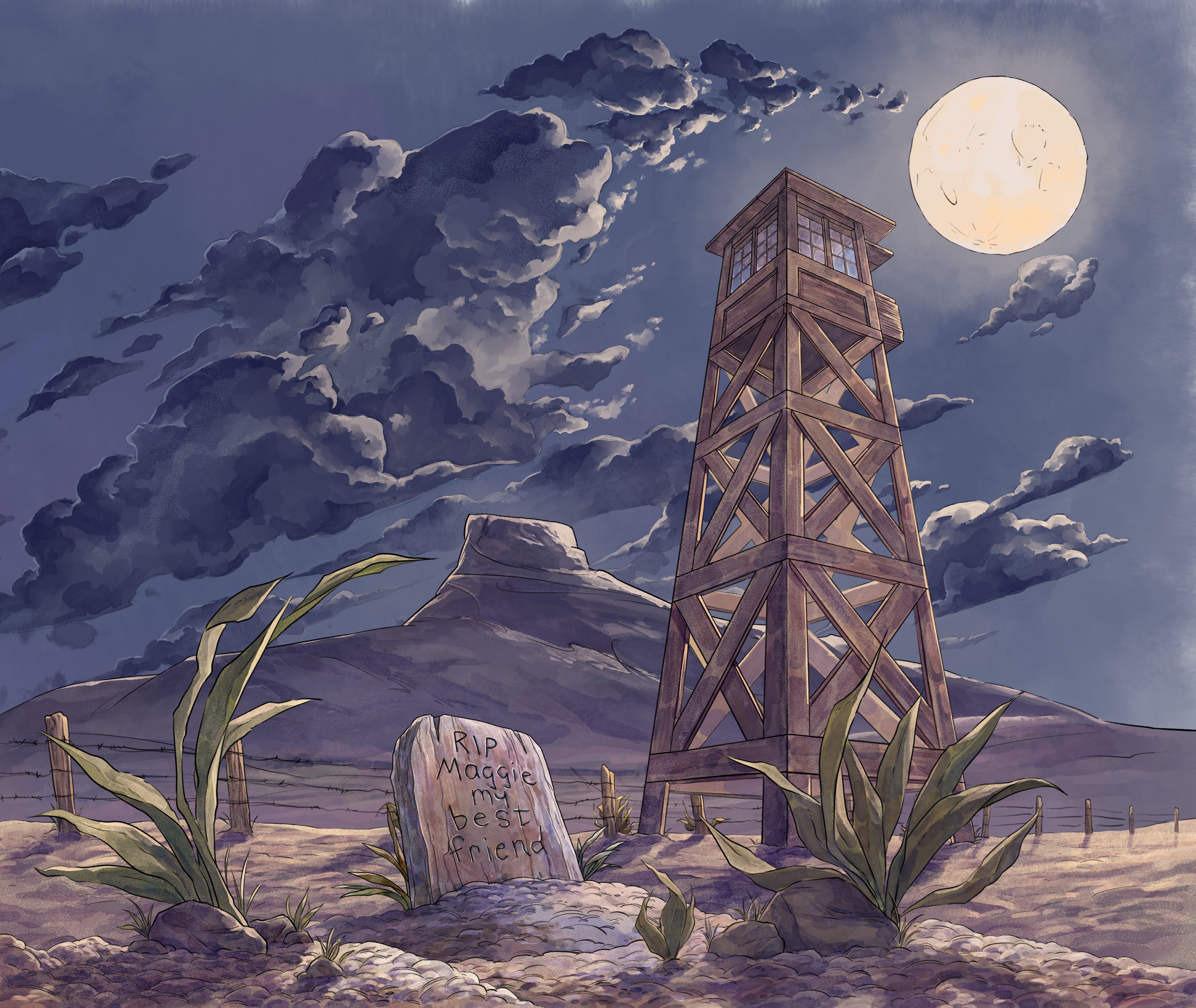 Gravestone, tower, and mountain done by other artists